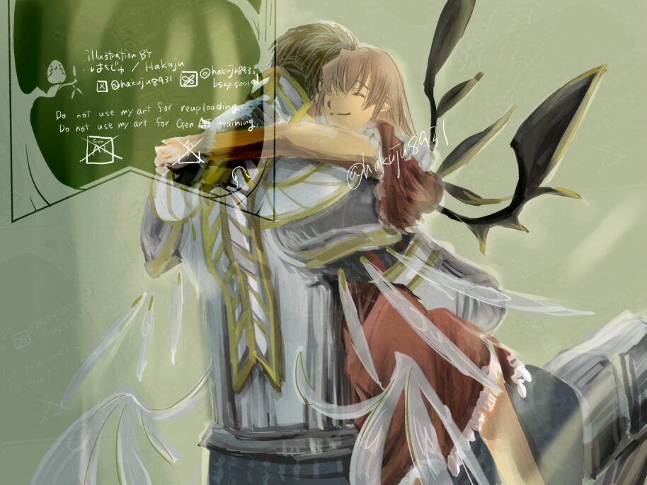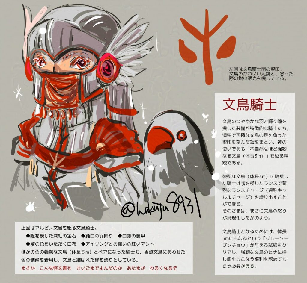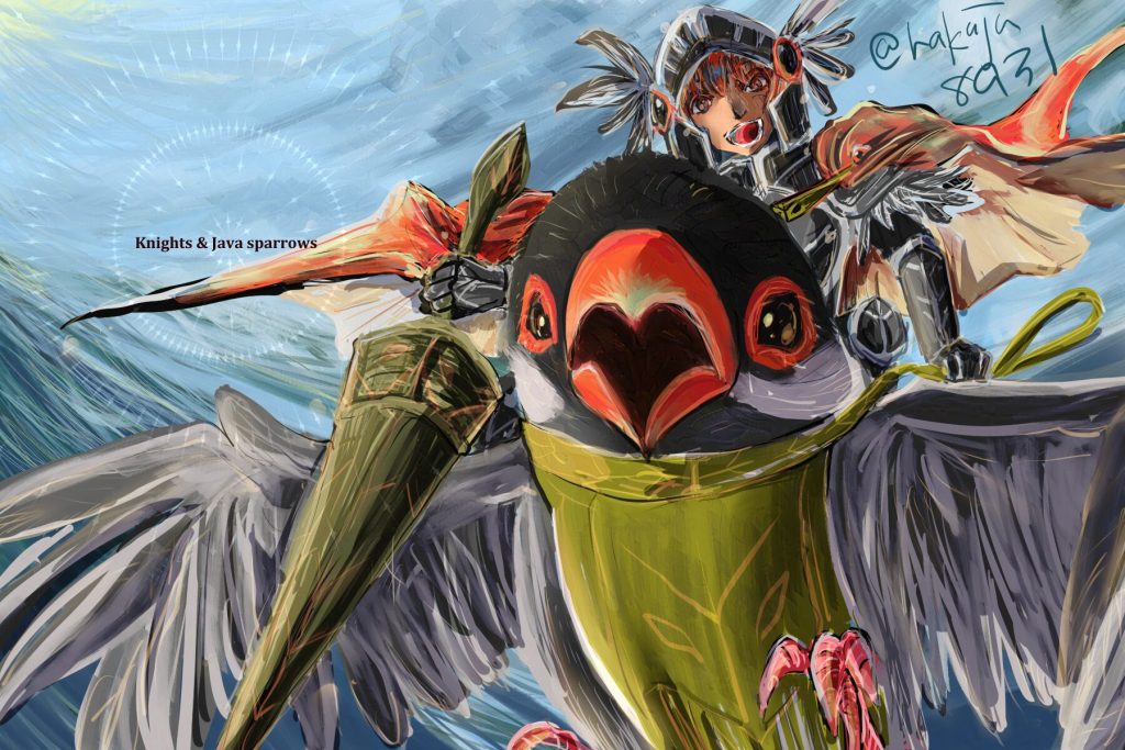 過去イラスト キャラクターイラスト 2025年5月24日 制作作品 描いた絵 2023-2025年ごろにSNSにアップしたもの 文鳥騎士の飛翔 文鳥騎士 リア充 フリル衣装の女の子 鎧の少年 じじい 金髪の女の子 銀髪褐色少年